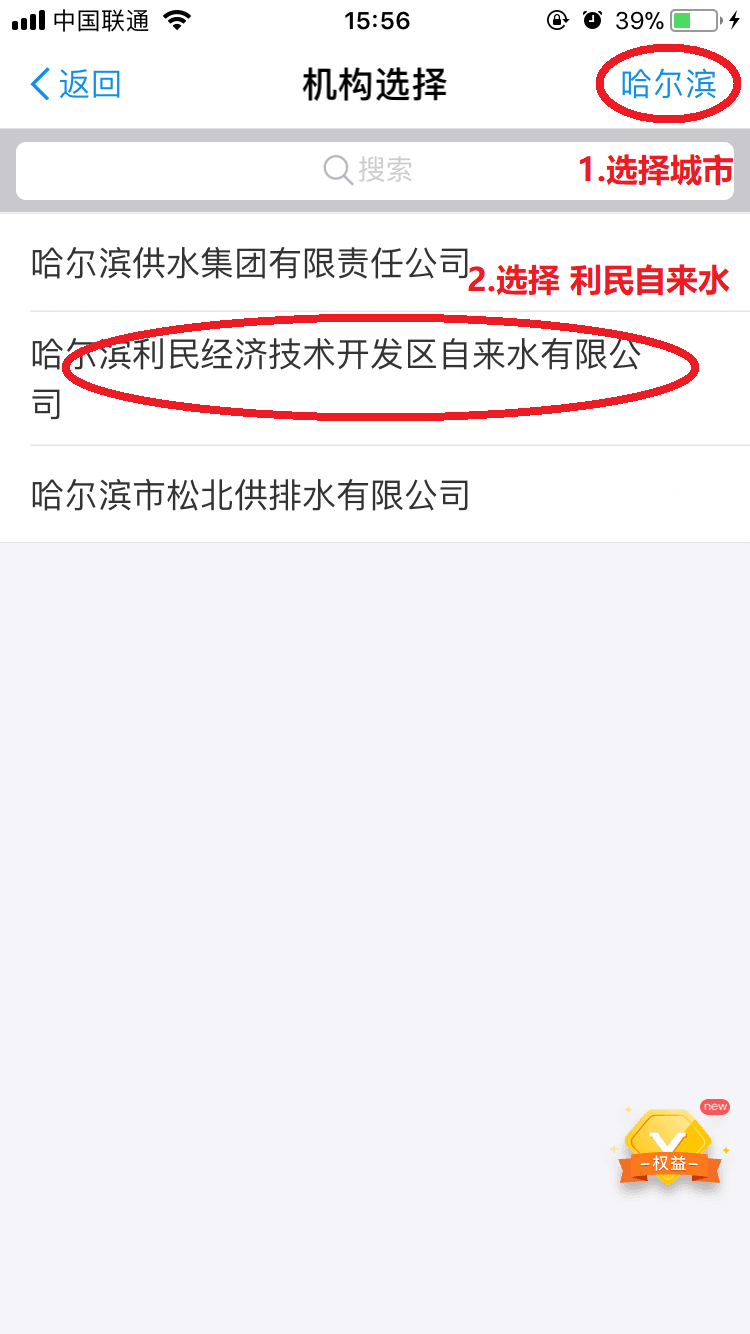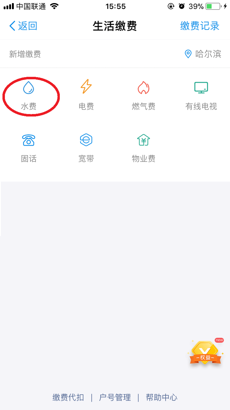 2、點(diǎn)擊水費(fèi)->選擇城市->選擇哈爾濱利民經(jīng)濟(jì)技術(shù)開發(fā)區(qū)自來水有限公司